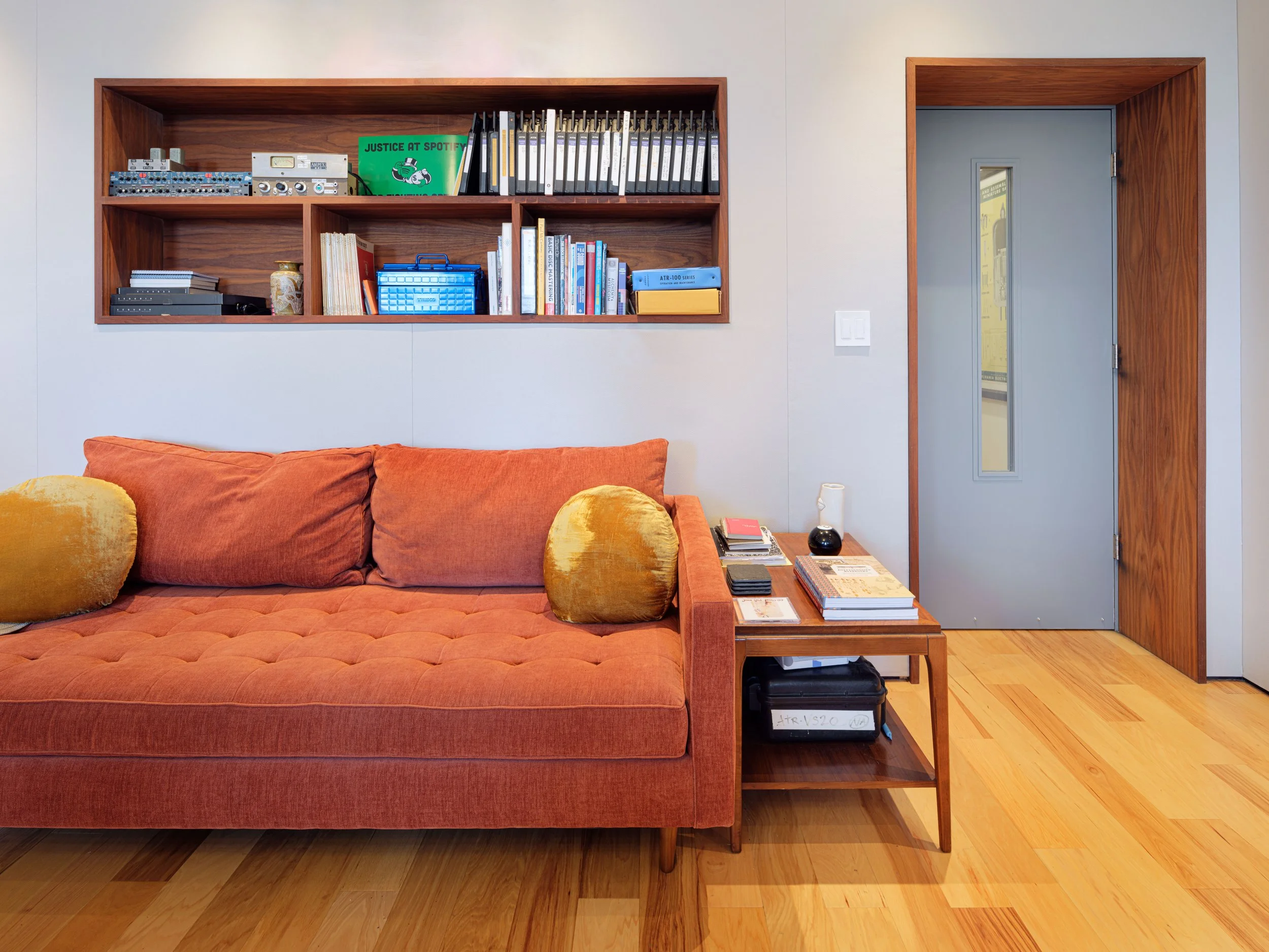 This studio included a full build-out of a 440 sq. ft. mastering level playback room, as well as the adjacent utility spaces. Natural light pours in through the custom angled glass window inserts, added for isolation from the Brooklyn neighborhood below. We achieved low frequency linearity in the room through extensive on-site testing of custom tuned membrane absorption, all hidden behind fabric walls. Above the mix position is a geometric design in fabric that echoes traditional Arabic architectural shapes, a subtle nod to the engineer’s roots. Walnut millwork accents the fabric walls and frames the acoustical door.